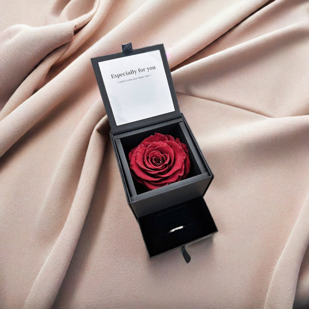 ダイヤモンドローズが合皮レザーボックスに入ってより高級感アップ。1輪でも存在感のあるダイヤモンドローズのギフトはプロポーズギフトとして選ばれています。